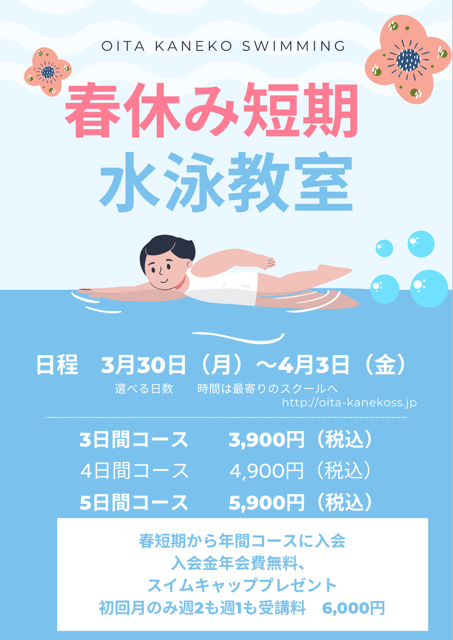 金子の春休み短期教室は今回は特別料金!習い事始めようか迷っている方にも 参加しやすい3日間、4日間、5日間と選べる日数設定です! ぜひ春休み水泳教室で水を克服してみませんか? お水大好きな子は、もっともっと上手に泳げるよ …